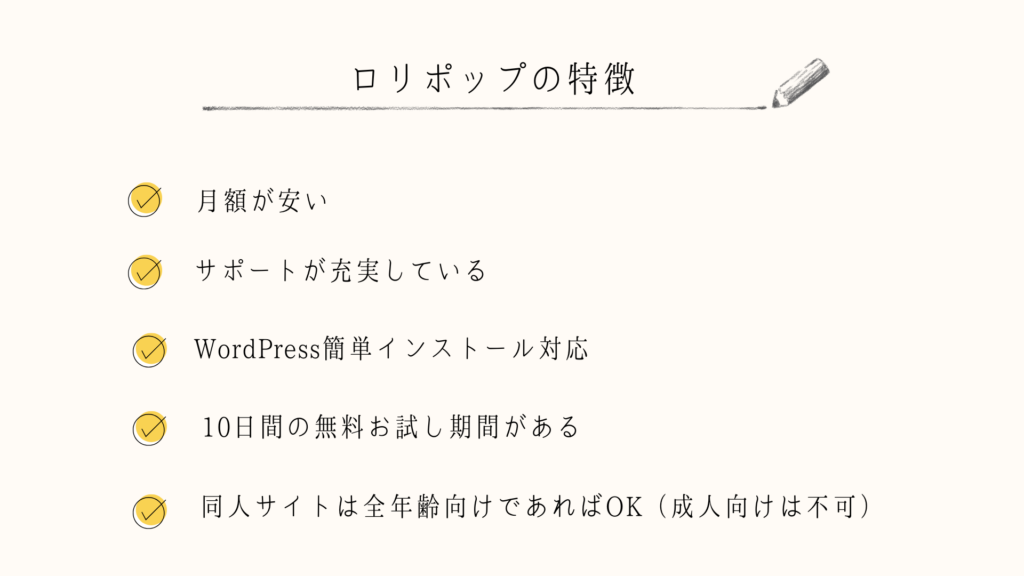 - 注意: WordPressは使えますが、電話サポートがなかったり、表示速度が他社より少し控えめです。また、成人向けリンクすらNGという規約の厳しさがあります。